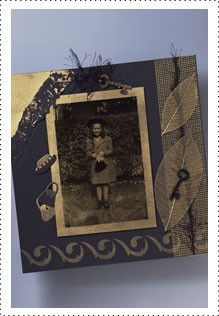 - Spray 18 KT Gold Plate on cardstock solidly. Cut a rectangle to mat photo and tear a piece for upper left corner and edge with Gold Leafing Pen.