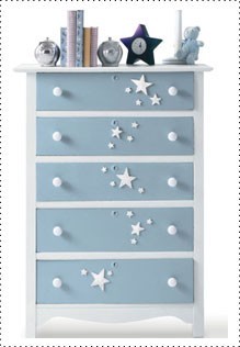 - Put drawers back into dresser. Lay dresser down on floor with drawer fronts facing upward. Determine placement of stars (refer to photo for example) and glue in place. Let glue dry completely before moving dresser upright.