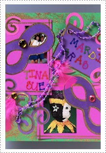 - Apply self-adhesive letters to spell 'Mardi Gras' to purple card. Add other captions as desired.