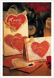 - Trace around the edges with gold and silver leafing pens. Write Love on the larger heart. Use the leafing pen with the point horizontal and with a very light touch, stroke along the paper on the two smaller hearts. The pens will highlight the fibers in the paper creating a shimmering look.