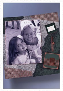 - Adhere photo. Place a strip of mesh on chipboard. Slice an opening in the middle and insert decorative copper plate. Adhere chipboard to layout.