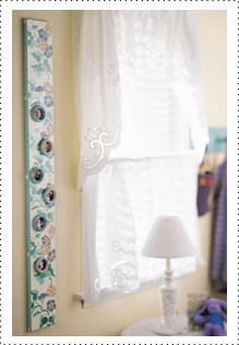 - To make frames: Apply 2-3 thin coats of Blue Ocean Breeze to primed wood rings. Let dry. Add floral detail by positioning flower stencil on ring and apply rich Plum, Mountain View, and Ballet Slipper. Glue photos to back of rings. Use cup hooks to hang frames.