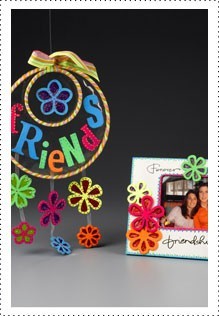 - Attach hoops together by tying with a bow at top. Use outside of large hoop as a template and cut circle from transparency film; adhere to back of hoops with Tacky Tape. Arrange letters and flowers on transparency and secure with Tack Tape.