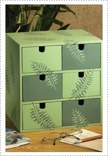 - Position stencil on three remaining drawers for a positive/negative effect, one design at a time to continue the pattern, and spray a fine mist of Celery over stencil. Leave the stencil in place for at least two minutes, then remove. Repeat on all three contrasting drawers. Let dry thoroughly.