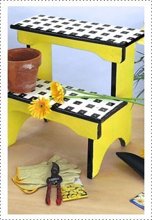 - To create checkerboard pattern on top of each step, position the tape in a vertical line across the entire step so that each edge of tape touches. Remove every other piece of tape. Repeat process in horizontal line. Spray each step and front edges of stool with black paint. Allow to dry.