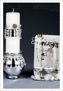 - Glue a strip of silver ribbon around the top edge of each of the crystal bead rows. Cut two 1 yard lengths of silver wire. Twist each around the pencil. Remove from pencil and twist one around the neck of the ivy bowl and the other around the candle as shown.