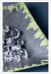 - To finish, pour lime glitter into votive cup till partially full, place tea light inside. Be careful not to get glitter on tea light when burning the candle. Place glass votive in bowl center, arrange rocks & clear jewels around it.