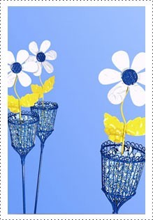 - Position candle holders in yard or flower pot of soil and pour clear marbles into wire candle holder. Insert painted daisy.
