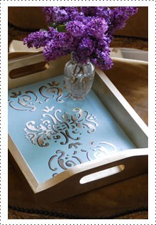 - Use the scroll stencil and lightly trace out the design with a pencil. Remove the stencil and fill in with Krylon 18kt. Gold Leafing Pen, which will create the design on the flat part of the tray.