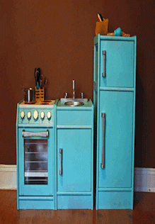- Then it's just a matter of lots of light coats of spray paint: All the handles, knobs and the sink got a coat of the silver metallic paint; The body of each appliance :o) got approximately four coats of the blue paint; The oven knobs I just taped off around them and painted instead of removing them.